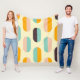 A seamless geometric pattern features vertical, oval shapes in soft yellow, teal, peach, orange, and brown, creating a retro, playful vibe.