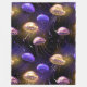 Padrão constante de águas-vivas brilhantes, ouros, roxas, desenhadas artificialmente, brilhantes sobre fundo do mar negro. Água-viva brilhante.