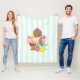 Um cobertor de velo ilustrado com uma tigela de sorvete com 3 scoops deliciosos cobertos de sprinkles doces. Um cone de sorvete também com 3 colheres de chocolate, baunilha e morango. Uma tigela de sobremesa cheia de sorvete com sabor neopolita com uma cereja deliciosa no topo. Um padrão de listras verdes e brancas no fundo.
