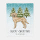 A ilustração original do desenho animado de Destei de um cachorro da raça Labrador Retriever, amarelo fofo. O cão é colocado numa cena de inverno com três árvores de abeto verde e neve caindo. O fundo é um gradiente azul a branco que dá à design aquele olhar frio do dia de inverno. Há também uma área de texto personalizável que diz agora "Feliz Natal!". Sob ela, há outra área de texto personalizável para um nome de família ou outro texto personalizado.