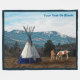 Uma cena da região noroeste do Pacífico dos Estados Unidos apresentando uma imagem de um nativo americano e seu cavalo perto de uma tipi. A neve se acumulou nas encostas mais altas das montanhas ao fundo. Adicione seu próprio texto.