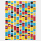 Um design composto por faixas com bandas pintadas à mão, blocos e manchas de cor em tons de vermelho, âmbar, ouro profundo, azul, cinza preto e branco. Inspirado por totens pintados.