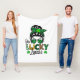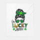 Este é um cobertor de velo divertido para celebrar a Rua. Dia de Patrick com um design com uma mulher com o cabelo em um pão vestindo óculos de sol e as palavras "Um Lucky Lassie".
