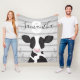 Um cobertor de velo que apresenta seu monograma, nome e uma ilustração de vaca. O cobertor tem um fundo de madeira de Cinza e folhas decorativas. Simplesmente personalize o nome e o monograma, adicione o cobertor ao seu carrinho e traga este cobertor quente para casa.