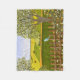 Um cobertor de velo com uma bela imagem da cena da natureza: Um pássaro sentado em uma cerca intacta, flores silvestres crescendo ao redor da cerca, um fazendeiro em um trator, trabalhando sua terra, árvores com folhas e fazendas com várias cores. Arte original por W.B.