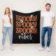 Ilustração de Halloween com design de texto e crânios "Spooky, Spooky, Spooky" em cores brancas, laranja e pretas