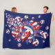 O cobertor de velo e velo da menina legal apresenta uma "explosão" de vários tamanhos: bolas vermelhas, brancas e azuis e formas vermelhas, brancas e azuis sobre um fundo azul mais escuro e personalizável - personalizado com o nome do atleta e o número da camisola - os painéis vermelho e azul dos volleybolas são misturados com um padrão caleidoscópico floral para uma aparência textuosa - por katz d_zynes