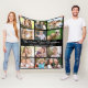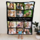 Uma colagem de 12 fotos mantém um cobertor preto de velo para a maior vovó do mundo. Você pode personalizar com doze fotos da família (8 retângulos e 4 quadrados) de netos, filhos, animais de estimação, etc, personalizar a expressão para "Eu te amo" ou "Nós te amamos", e se ela é chamada de "vovó", "vovó", "mamã" etc., e adicionar uma segunda linha de texto, como nomes de família, na tipografia branca.