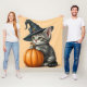 Whimsical Little Kitten Wearing A Witch’s Leaning on A Pumpkin. Perfect Adorable Halloween Kitten Blanket For Those Cool Fall Nights. Halloween Kitten. Adorable Witchy Halloween Kitten.