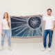 Um design de gradiente mágico, branco, dourado e da lua mandala azul e lacrimogêneo, com flores e folhas, estrelas, pontos, diamante, círculos, triângulos, formas de chevron, escala de sereia, padrão geométrico, feito com uma cor branca vibrante e brilhante, com uma lua brilhante palco crescente, uma estrela da flor da mandala, em tom azul marinho, e fundo de gradiente azul claro. Este lindo, místico, tema do universo, sol fofo, henna, trabalho de arte do estilo mandala, impressão de imagem original.
