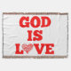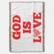 Este cobertor apresenta um pedaço de cinco impressão com letras vermelhas mostrando o ditado bíblico "Deus é o amor" com o O no amor feito substituído por uma coleção da palavra Amor feito em um coração neste tema bíblico de citação. Este cobertor é feito com 75% de algodão e 25% de poliéster com uma lavagem manual muito macia recomendada.