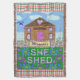 A "Ela Cama" é a resposta da mulher à Caverna do Homem. Este design de cobertura original é para mulheres que adoram escapar para o seu próprio quintal. Ele tem uma foto de um galpão giro, uma cerca branca de piquete, cobblestones, um pássaro e um jardim de flores. As palavras "Ela Cama" também têm um padrão floral. As partes superior e inferior estão bordadas em uma xadrez rosa e lacrimejante.