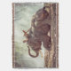 Um cobertor tecido mostra um jovem asiático, deitado atrás de um grande elefante reclinando, lendo um livro. O menino está sem camisa, vestindo shorts e calçados marrons. O elefante é uma cinza, com presas compridas, e está deitado em um leito de folhas. O fundo é uma cena florestal desfocada. O cobertor tem uma borda de borda. A imagem é fotografada com iluminação suave e difusa, dando-lhe uma sensação de calor e nostalgia.