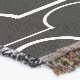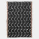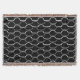 Este cobertor de lançamento tem um design de deco de arte de meio círculo branco se conecta a linhas em um campo de preto.