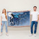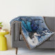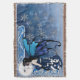 Raven cabelou fada toda em azul. A lua brilha intensamente ao seu lado. Flocos de neve e nó celta funcionam num pano de fundo de ombre azul.