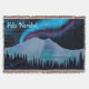Luzes de norte roxas e azuis brilham sobre montanhas cobertas de neve em uma noite fria no Alasca. "Feliz Navidad" aparece em azul e branco brilhantes.