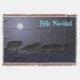 Uma noite de inverno fria e lua; uma mochila na prole. "Feliz Navidad" aparece em azul e branco brilhantes.