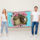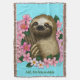 Uma preguiça bonita sentada entre flores cor-de-rosa contra um pano de fundo azul