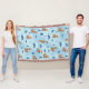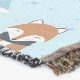 Charming red foxes in scarves wander a snowy blue forest of evergreens and mountains. Whimsical and wintery, perfect for cozy style.