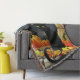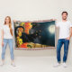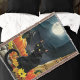 Um gato preto se senta na porta com abóboras, lanterna, vassoura, folhas de outono e lua de colheita de cheio atrás.