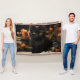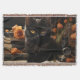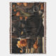 Gato de trigo e flores. Flores laranja, livro velho e gato preto bonito sentado numa mesa de madeira. Animais engraçados, animais de estimação peludos. Pintura a óleo de arte.