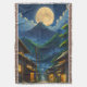A lua brilha sobre uma pequena cidade em Java, Indonésia, com uma montanha grande ao fundo.