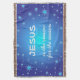 Jesus é a razão para os cobertores de Natal da época com fundo azul metálico e flocos de neve brancos e brilhantes.