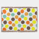 Este cobertor de lama tem um design geométrico de pontos azuis, laranja, amarelo e castanho.