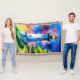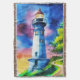 Throw in a watercolor style portrait of a lighthouse standing tall under a vibrant, star-filled night sky. Surrounded by lush green trees and soft grassy hills, its golden light glows warmly, creating an atmosphere that evokes wonder and tranquility.