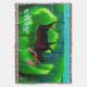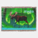 Uma imagem de um alce silenciada contra as luzes do Norte, um pouco estilizada. A leitura de texto "Alaska" aparece em azul e branco brilhantes.