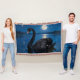 A detailed black swan glides on a calm lake under moonlight. This image features complementary colors and reflections, evoking classical academic and romantic art styles.