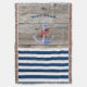 Esta imagem apresenta um nome de barco e âncora em um fundo listrado azul e branco marinho.