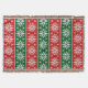 Scandinavian-inspired faux-knit pattern of snowflakes, diamonds, and festive stripes in red, green, white, and gold.