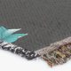 Este produto apresenta um belo padrão floral sobre fundo negro com folhagem verde e flores atraentes em turquesa, e coral.