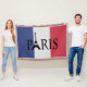 Ilustração de design de texto de Paris com decoração em Torre Eiffel sobre fundo de bandeira francesa de moagem