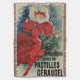 Ilustração antiga de um cartaz publicitário Art Nouveau Pastilles Geraudel por Jules Chéret, 1895. Este design de cartaz de anúncio de produto apresenta uma senhora feliz e saudável em um vestido vermelho brilhante carregando um guarda-chuva enquanto neva durante uma tempestade de neve de inverno. Ela está segurando um recipiente com pastilhas para tosse da Geraudel. O texto diz "Si vous toussez prenez de Pastilles Géraudel."