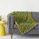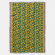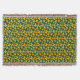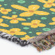 Padrão floral sem costura com pequenas flores amarelas e pontos turquesas sobre fundo verde escuro.