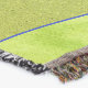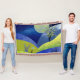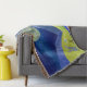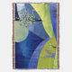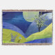 Uma paisagem de abstrato que representa colinas rolantes com primavera e plantas florescentes e uma lua e estrelas em tons de azul, ciano, amarelo e rosa.