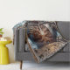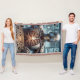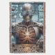 A humanoid robot is seated at a workbench surrounded by tools and intricate components. The setting is futuristic with digital screens in the background.