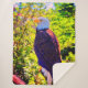Uma águia majestosa careca está empoleirada em um galho, seu olhar afiado dirigido ao lado. Sua cabeça branca e cauda contrastam nitidamente com o corpo castanho-escuro e asas contra um pano de fundo de folhagem verde-escura.