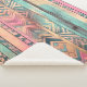 Aztec design tribal, nativo americano, com cor d'água, apresentando um padrão geométrico a sudoeste em tons azuis, cor-de-rosa e laranja pastel sobre fundo de grãos de madeira.