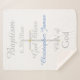 O Elegante Baby Baptism, de tamanho médio, mantém o cobertor com cruz prateada pintada manualmente no centro com o aspecto de sotaques dourados. Personalize com o nome do bebê primeiro e médio em texto azul e Data do batismo em escrita prateada. Batismo, Deus abençoe, Criança de Deus está escrita em prata. O pequeno e elegante bebê rattle está no canto inferior esquerdo do cobertor com a estrela azul, a aparência de um arco azul brilhante e bonito com sombra. O amor é escrito em texto branco dentro de chocalho. Um belo cobertor de velo faria um presente especial para o bebê, filho da puta. Perfeito para exibir fotos acarinhadas na geladeira, no cavalete, no arquivo, etc. NOTA: Dependendo do tamanho, você pode ajustar o tamanho do Baby Rattle clicando em personalizar e pressionando o botão e aumentar para aumentar em pequenos incrementos (se um ponto de exclamação de aviso aparecer diminuir em um incremento), e pode mover a imagem e a posição do dentro de Amor. Trabalho de arte gráfico original e Design © TamiraZDesign.