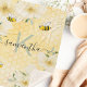 Um ouro de fundo com um padrão de colmeia de abelhas e um sorriso feliz de abelhas. Decorados com flores tropicais de Hibiscus, flores e verde creme. Personalize e adicione seu nome e letra monográfica, letras verdes e pretas. O nome é escrito com um script de estilo manuscrito com traços. Para manter as hastes, exclua apenas o nome da amostra, deixe os espaços ou emoji na frente e depois do nome.