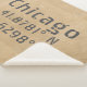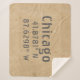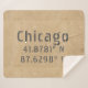 Coordenadas de latitude e longitude de Chicago com fontes modernas e urbanas na cinza, sobre fundo de papelão com manchas aquáticas