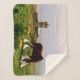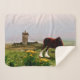 Um bonito garanhão Clydesdale esfola perto de um castelo antigo.