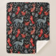 Illustrated black background features patterned red and blue birds, a rabbit, and a deer among white floral designs, creating a whimsical, folk-art style.