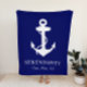 Um cobertor moderno de temas náuticos para o seu barco com uma âncora branca sobre um fundo azul marinho. Você pode personalizar o nome e a localização do seu barco em tipografia branca elegante.