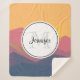 Um cesto sherpa com uma ilustração gráfica com muitos cumes de montanha com luz solar amarela brilhante atrás das montanhas. Feito com formas poligonais geométricas.design minimalista simples. As cores vão do azul escuro ao vermelho deserto. Um círculo branco colocado sobre o topo com o seu monograma inicial e o seu nome dentro.
