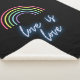 Comfy sherpa blanket com uma mensagem simples: O amor é o amor - a defender o amor independentemente da adversidade, orientação ou identidade - no texto de escrita neon com um arco-íris neon colorido. É melhor em fundo escuro.