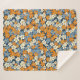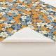 Um padrão floral vibrante cobrir toda a imagem. Flores pequenas e estilizadas em tons de laranja, azul claro e esbranquiçado são dispostas densamente sobre um fundo azul marinho. As flores têm um aspecto ligeiramente imperfeito, pareceria, com variações na saturação e forma das cores que dão ao padrão um aspecto texturizado, quase pintado à mão. O padrão repetido cria um efeito visual alegre e ocupado.